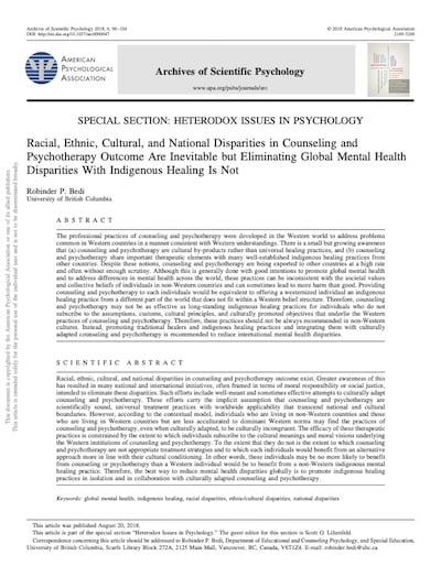 Racial, ethnic, cultural, and national disparities in counseling and psychotherapy outcome are inevitable but eliminating global mental health disparities with indigenous healing is not.