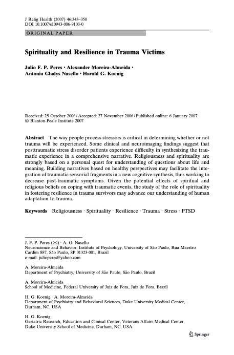 This article argues that spiritual and religious beliefs can impact individuals’ ability to cope with traumatic events.